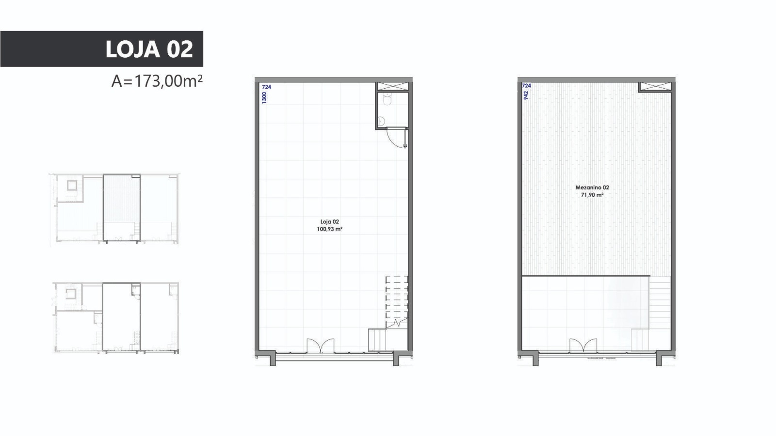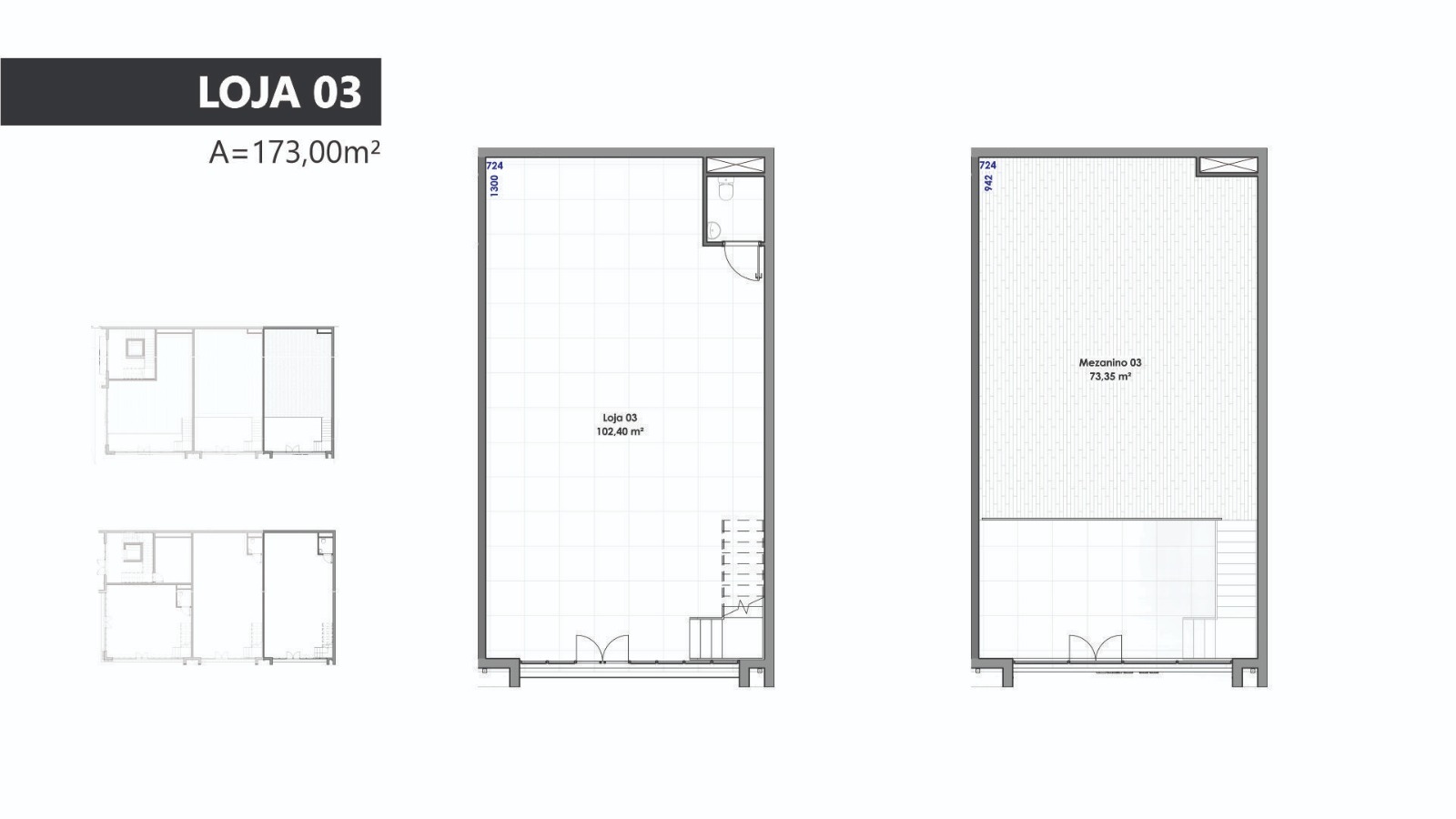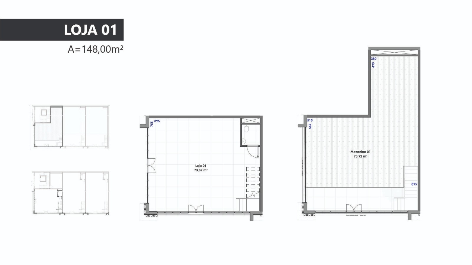 As lojas terão pé direito duplo e mezanino, com as seguintes áreas:
